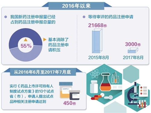 2016年以來,我國新藥注冊(cè)申報(bào)量已經(jīng)占到藥品注冊(cè)申報(bào)總量的55%,基本消除了藥品注冊(cè)申請(qǐng)積壓,等待審評(píng)的藥品注冊(cè)申請(qǐng)已由2015年8月份的21668件降至2017年8月份的3000件??股睾鸵呙缗R床試驗(yàn)申請(qǐng)、中藥民族藥注冊(cè)申請(qǐng)也已實(shí)現(xiàn)按時(shí)限審評(píng)。