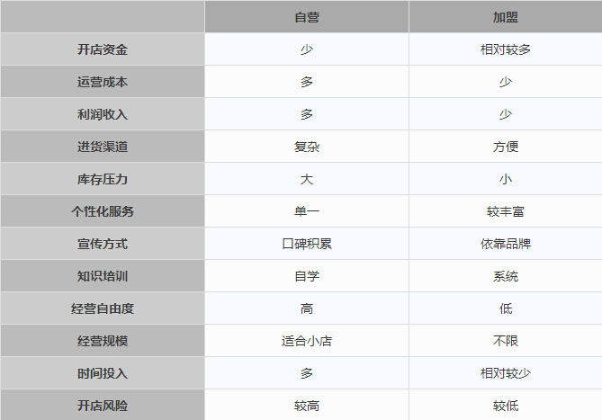 時尚貨架根據(jù)母嬰店的開店準備和后期運營,將加盟母嬰店和自營母嬰店的區(qū)別總結(jié)成一個表格,希望可以對你有所幫助: