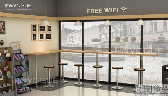 櫥窗吧臺是一種常用的休閑區(qū)打造方式。使用這款時尚貨架設計的,可以根據(jù)櫥窗大小定制長度的吧臺,加上幾把高腳凳,既不會占用過多便利店空間,還顯得簡約雅致。