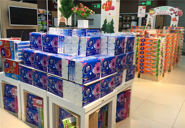 衛(wèi)生紙——這類商品的在各個(gè)家庭中的日常消耗量很大,所以在超市里的銷售速度往往是最快的,很適合采用量感陳列的方式,并要注意及時(shí)補(bǔ)貨,盡量避免超市貨架出現(xiàn)空缺。