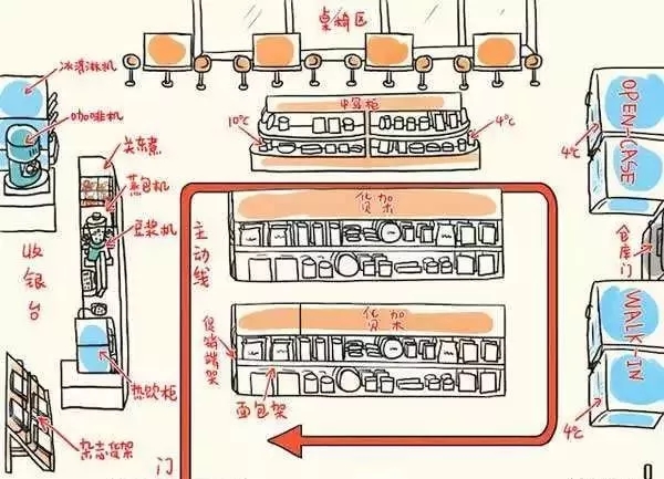 這樣擺放貨架,會自然形成一個映帶顧客向右側(cè)行走的主通道,貨架之間還留有多個副通道,非常符合人們平時的購物習(xí)慣。