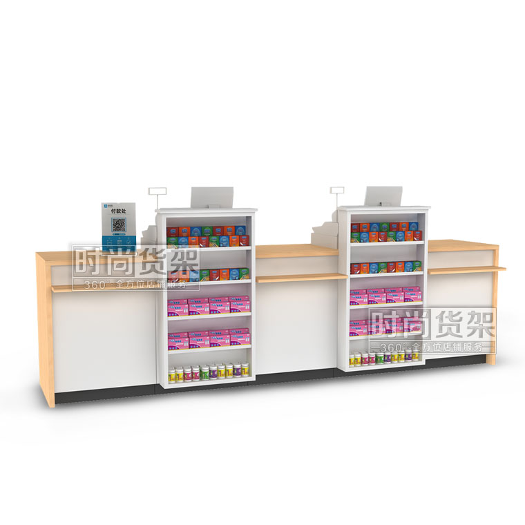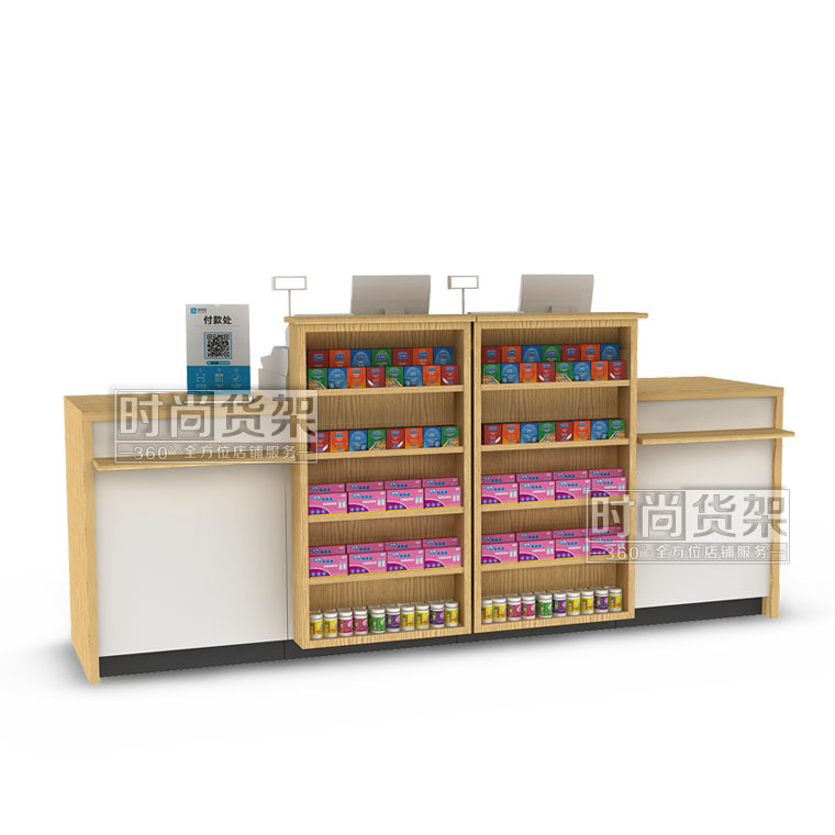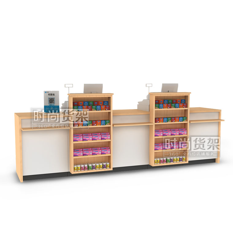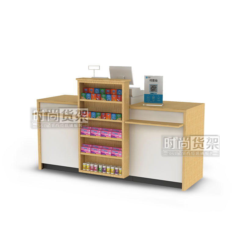 這是深圳貨架廠——時尚貨架最新推出的一款適用于母嬰店收銀區(qū)的母嬰店木紋收銀臺,想了解其他貨架請咨詢客服。