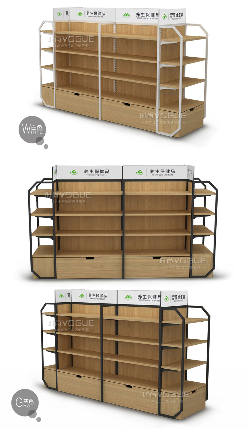 【產(chǎn)品名稱(chēng)】開(kāi)放式藥店貨架/木背板藥店貨架/帶地柜藥店貨架