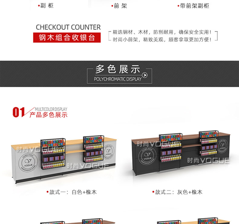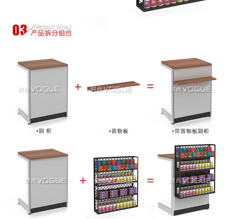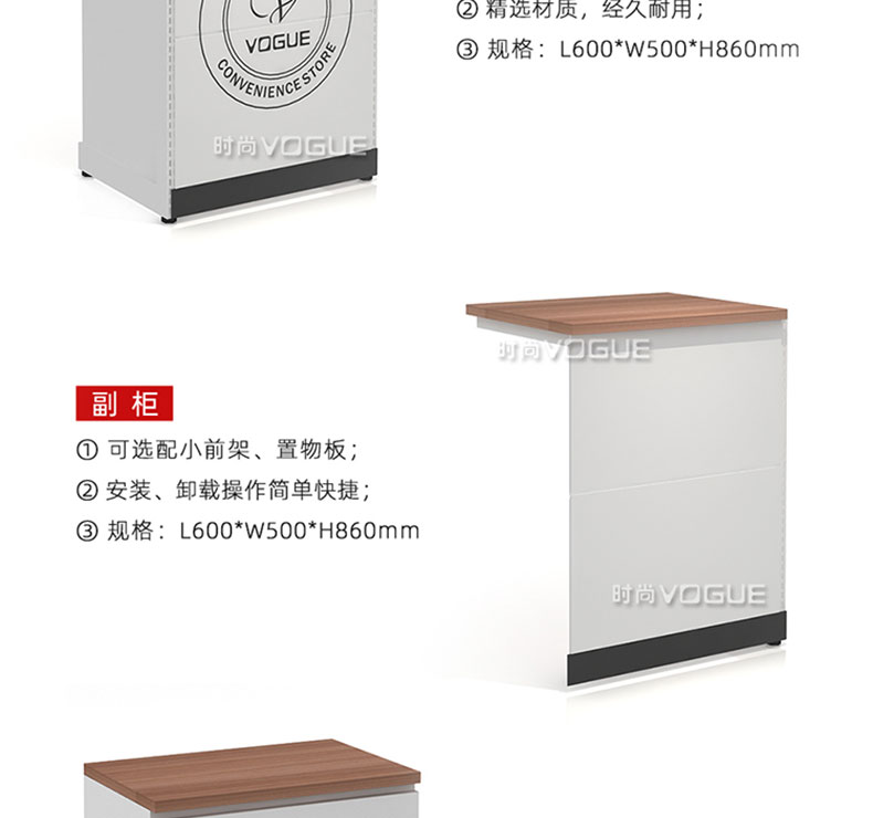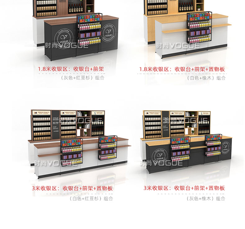【特點】組合形式,滿足不同收銀區(qū)需求;精選材質(zhì)使用壽命長;擴(kuò)展側(cè)面空間增強(qiáng)收銀臺功能