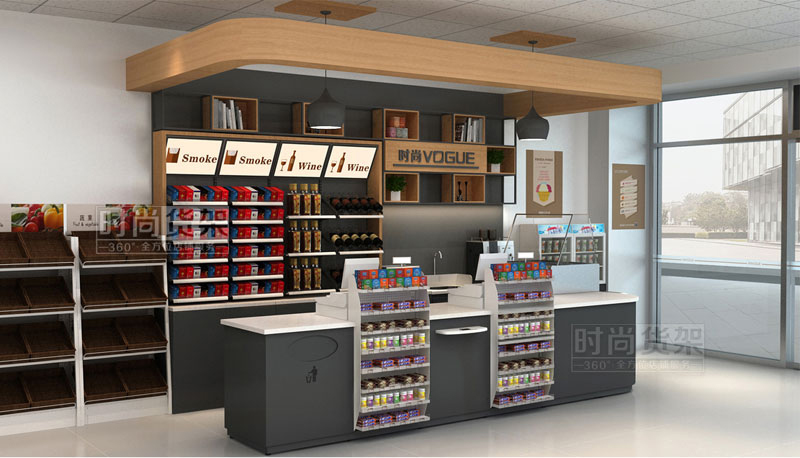 便利店的面積都不大,所以煙酒架通常都是擺放在便利店收銀臺后面,兩者組合在一起構(gòu)成完整的收銀區(qū)域。這樣做既能節(jié)省店面內(nèi)有限的空間,又能因?yàn)闊熅票旧砭哂械母呦男远碳ゎ櫩拖M(fèi)。