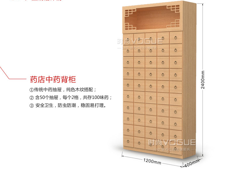 這款中藥柜也是組合形式的,對于組合形式來說它最大的優(yōu)點就是可以靈活選擇,搭配出最合適店鋪陳列的尺寸。中藥柜柜體同樣由高檔環(huán)保板制作而成,再加上先進的工藝技術(shù)處理讓柜體本身具有防蟲防潮防鼠的特點,避免了珍貴重藥材的丟失或損壞。