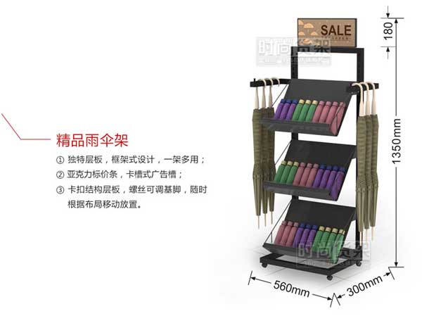 啞光質(zhì)感的深灰色設(shè)計(jì)讓這款便利店雨傘架更具時(shí)尚感,不再僅僅只是一個(gè)陳列道具,更是一個(gè)精美的藝術(shù)品,增強(qiáng)商品陳列展示效果。真材實(shí)料的優(yōu)質(zhì)冷軋鋼材質(zhì)讓這款雨傘架擁有更穩(wěn)固的結(jié)構(gòu),且耐磨防刮,使用壽命長(zhǎng)。了解這款雨傘架詳情請(qǐng)點(diǎn)擊http://www.hljzzgx.com/store/xxq/91.html。