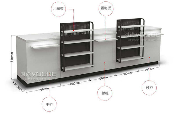藥店收銀區(qū)最容易引起顧客沖動(dòng)性消費(fèi),是店鋪內(nèi)重要的銷售區(qū)域。上圖所示是時(shí)尚貨架打造的一款組合式藥店收銀臺(tái),整體包含主柜、付柜、轉(zhuǎn)角柜,能根據(jù)店鋪規(guī)模大小配置合適的付柜組數(shù),滿足各類藥店使用。