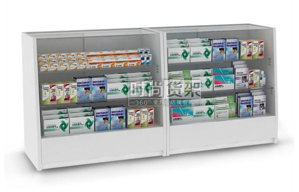 因?yàn)樘幏剿幱兄荒鼙浑S意購(gòu)買(mǎi)的特性,所以處方藥區(qū)域一般都要設(shè)置成封閉式的形式。上圖所示就是藥店貨架生產(chǎn)廠家【時(shí)尚貨架】打造的一款藥店處方前柜,其臺(tái)面及層板均為高透光度的清玻璃材質(zhì),更方便顧客看到處方前柜里所陳列的藥品。