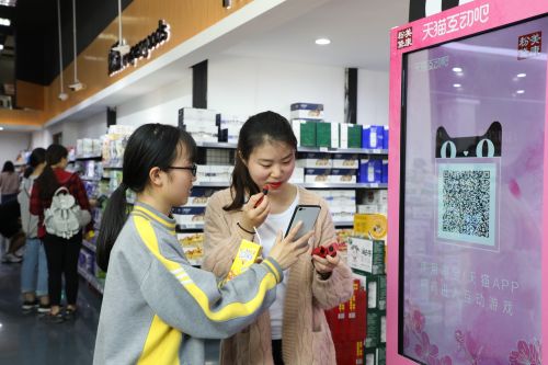 在這所男女比例3:7的高校,女大學(xué)生成為了絕對的消費(fèi)主力軍。天貓互動吧派樣機(jī)、天貓魔鏡擠滿了女大學(xué)生,按照界面的指引進(jìn)行操作體驗(yàn),試口紅。