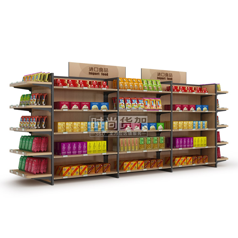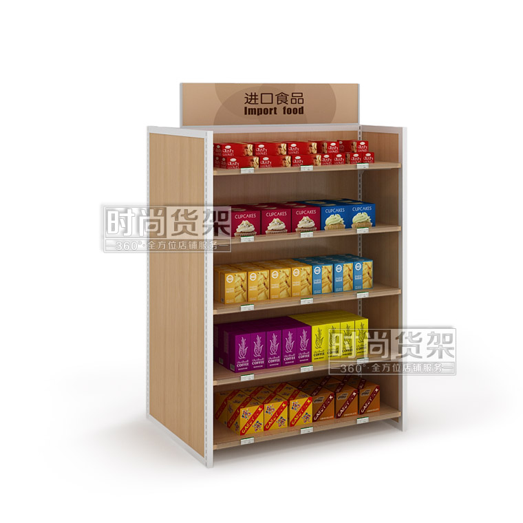 【產品名稱】便利店雙面食品貨架/進口食品貨架/木背板零食展示架